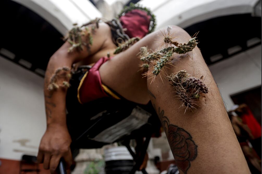 Después se colocan cadenas Cruzadas en espalda y pecho, y amarradas en los tobillos, que en conjunto llegan a pesar de 25 a 80 kilos por persona, para desespués clavarse espinas con las de recorreránán tres kilómetros, en alusián al urbarsiSciNas de jesucristo de jesuce de jesuco de jesucristo de jesucra de jesucristo.