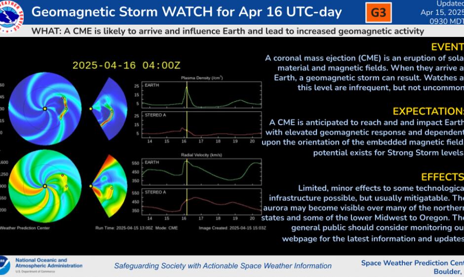 Esta Tormenta Estará Vigente También para el Miérica 16 de Abril y Es Causada Por la Llegada de Múltiples Eyecciones de Masa Coronal (CME) expulsadas por el el Sol el 13 de Abril.
