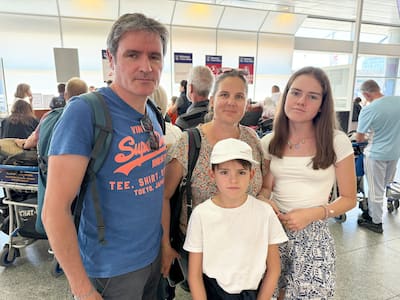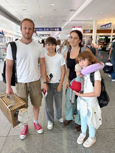 Frente al quiosco de Lufthansa, Yoan y Camille estaban esperando con sus hijos, Juliette, de 14 años, y Víctor, de 10 años …