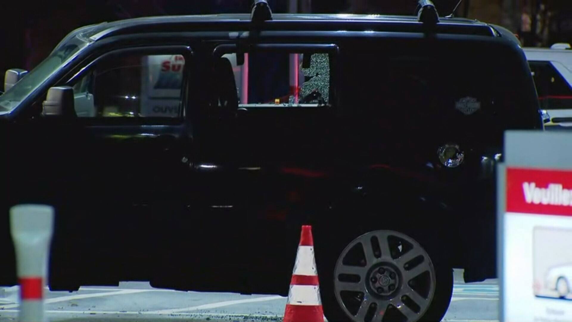 En las imágenes captadas por TVA Nouvelles, un Jeep Liberty está estacionado junto a los surtidores de gasolina de un Petro-Canada. La luneta trasera derecha del vehículo quedó destrozada.