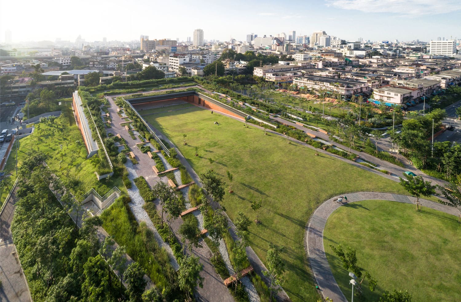 La ciudad de Bangkok, fuertemente amenazada por lluvias torrenciales, ha transformado un parque en un enorme depósito de agua con forma de sistema de raíces, según informa Puesto científico.
