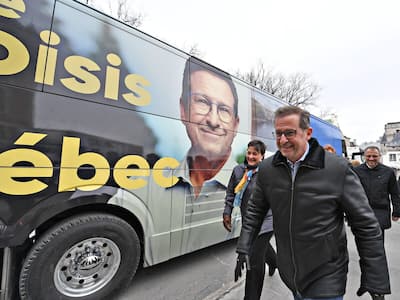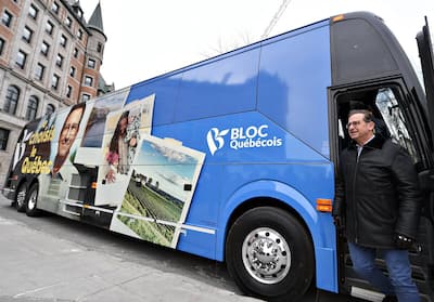 El bloque de Québécois dio a conocer su nuevo autobús de campaña en Quebec a pocos pasos de Château Frontenac.