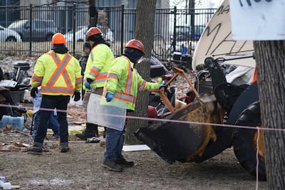 Anteriormente, equipos del ministerio y de la ciudad de Montreal estaban trabajando para desmantelar otra parte del campamento en Morgan Park. Los tres ocupantes se trasladaron al otro lado de la valla.