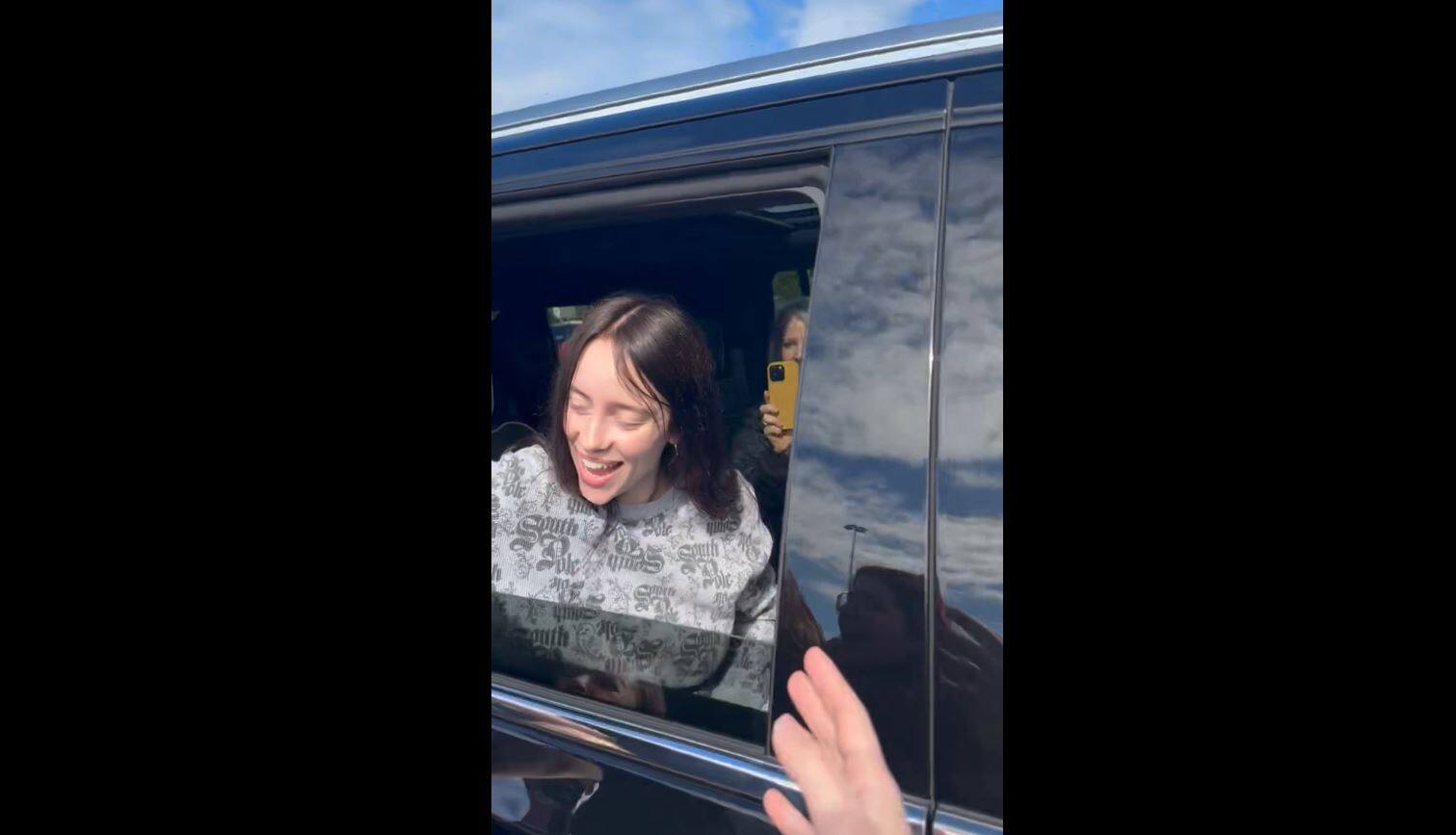Rápidamente se reúnen alrededor del vehículo, cuya ventana trasera abierta permite a Billie Eilish saludar a sus fans.