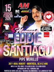 ¡Prepárate para una noche llena de salsa, ritmo y nostalgia! El 15 de febrero de 2025, rendimos homenaje a Eddie Santiago, uno de los íconos más grandes de la salsa. Acompáñanos en esta celebración única con la presentación especial de Pipe Morillo. ¡Una noche para recordar!