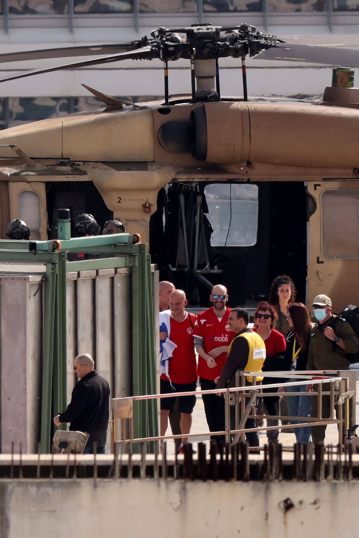 Esta foto distribuida por el ejército israelí muestra a Sagui Dekel-Chen, recientemente liberado, siendo unido con su esposa (izquierda) y su padre en un lugar no reconocido en Israel, el 15 de febrero de 2025.