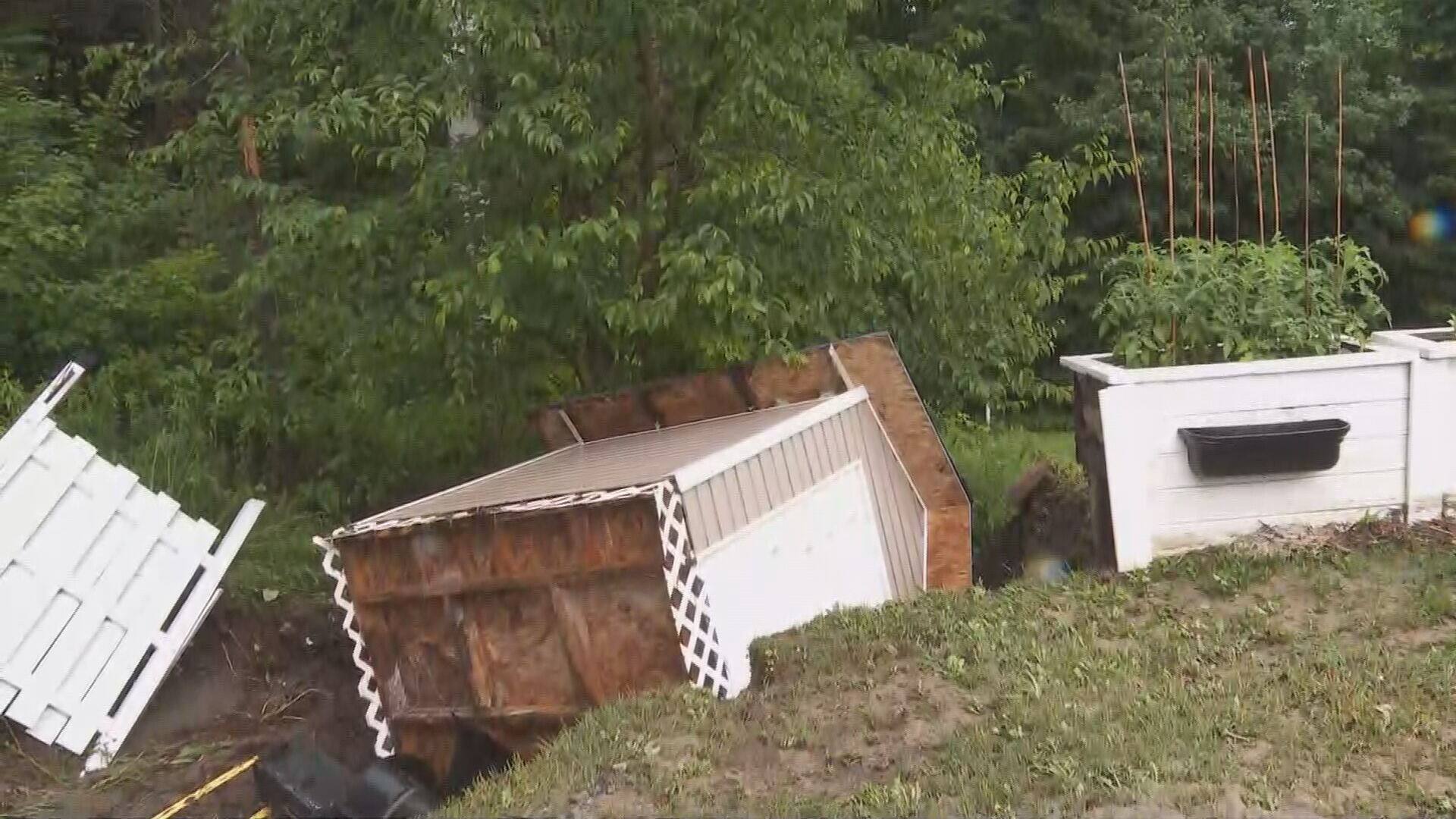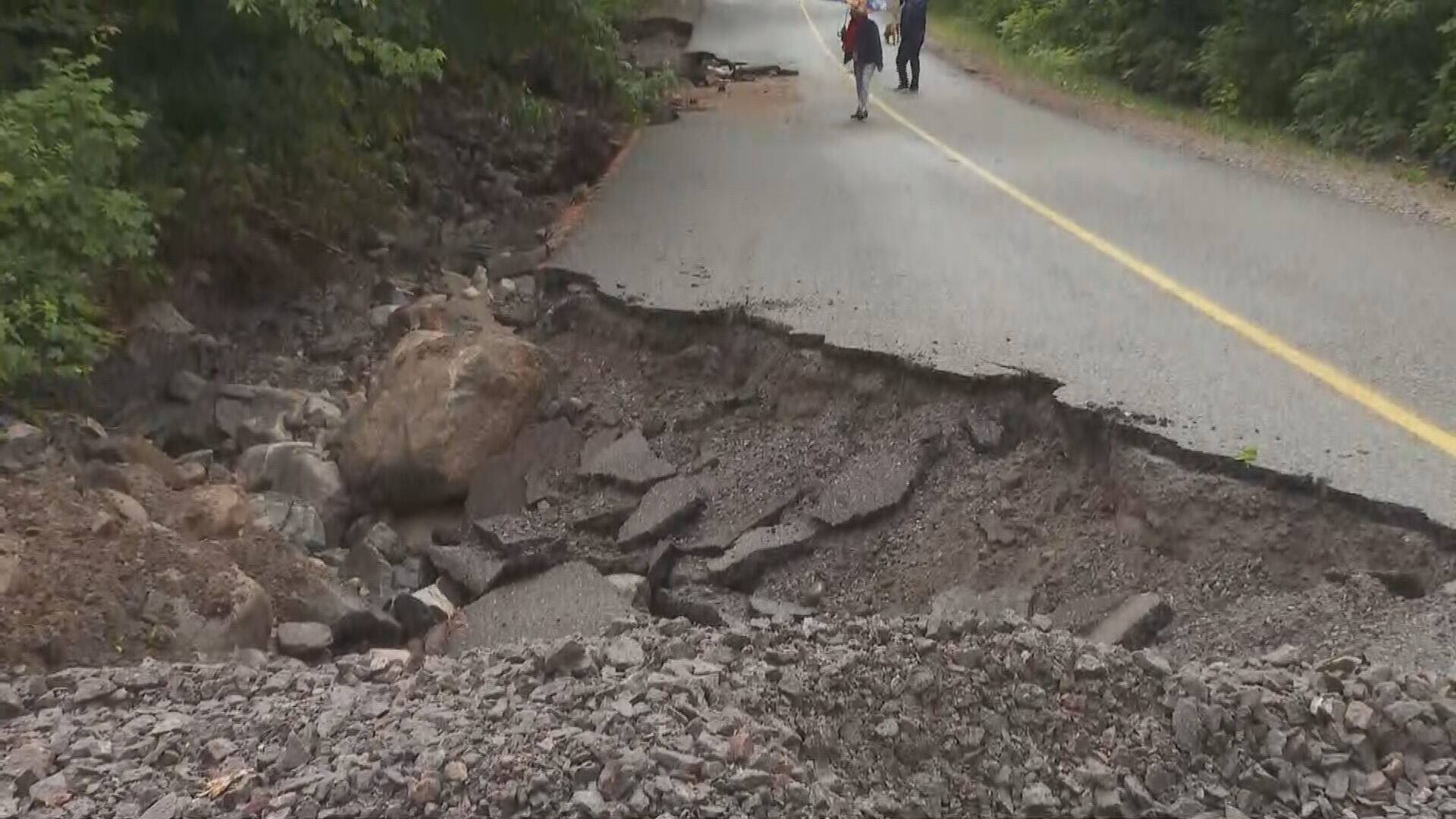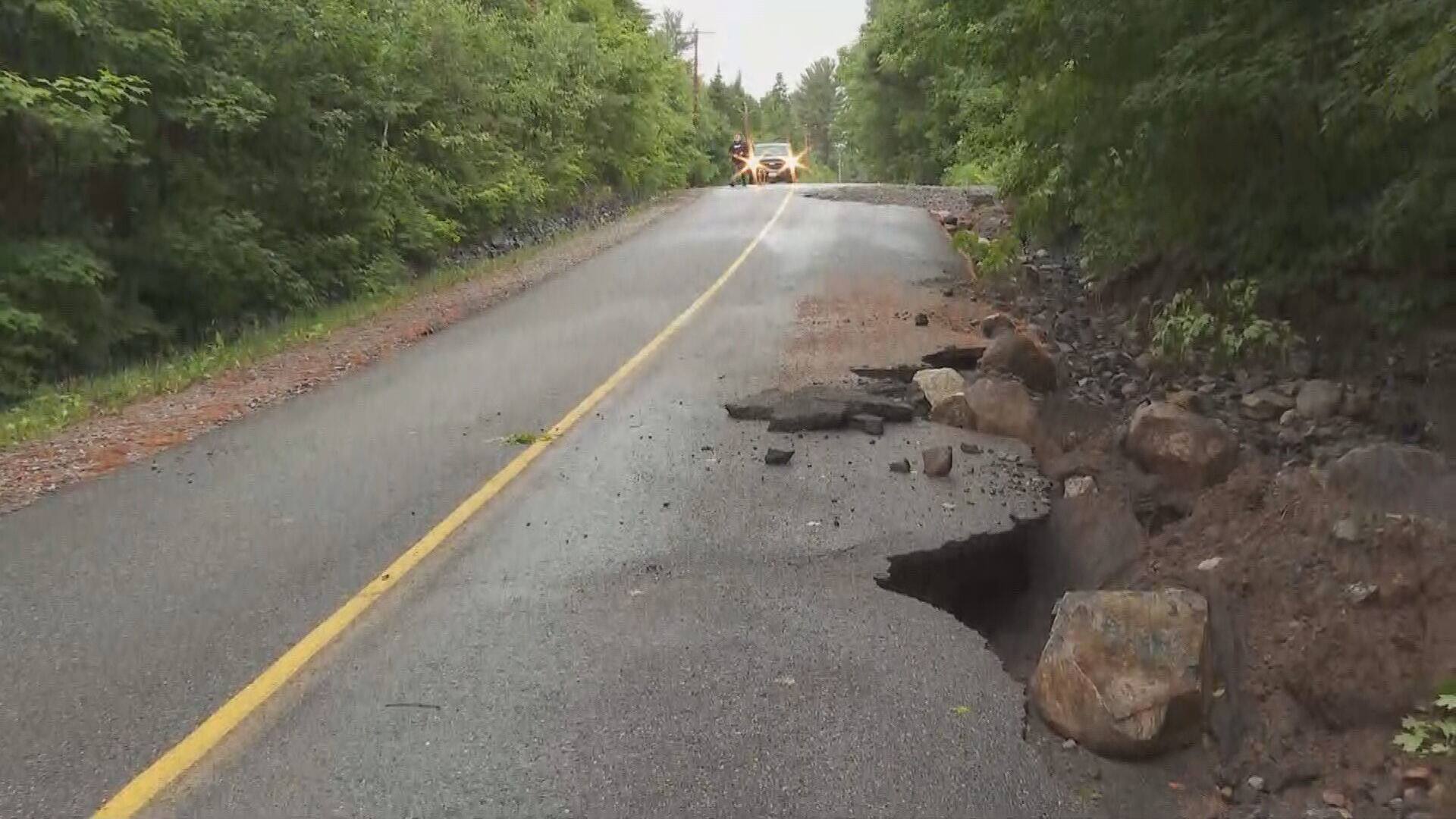 Las carreteras resultaron dañadas en Chertsey, en Lanaudière, tras importantes acumulaciones de lluvia recibidas durante la jornada del domingo, lo que provocó que “centenares” de residentes se quedaran sin salida al mar.