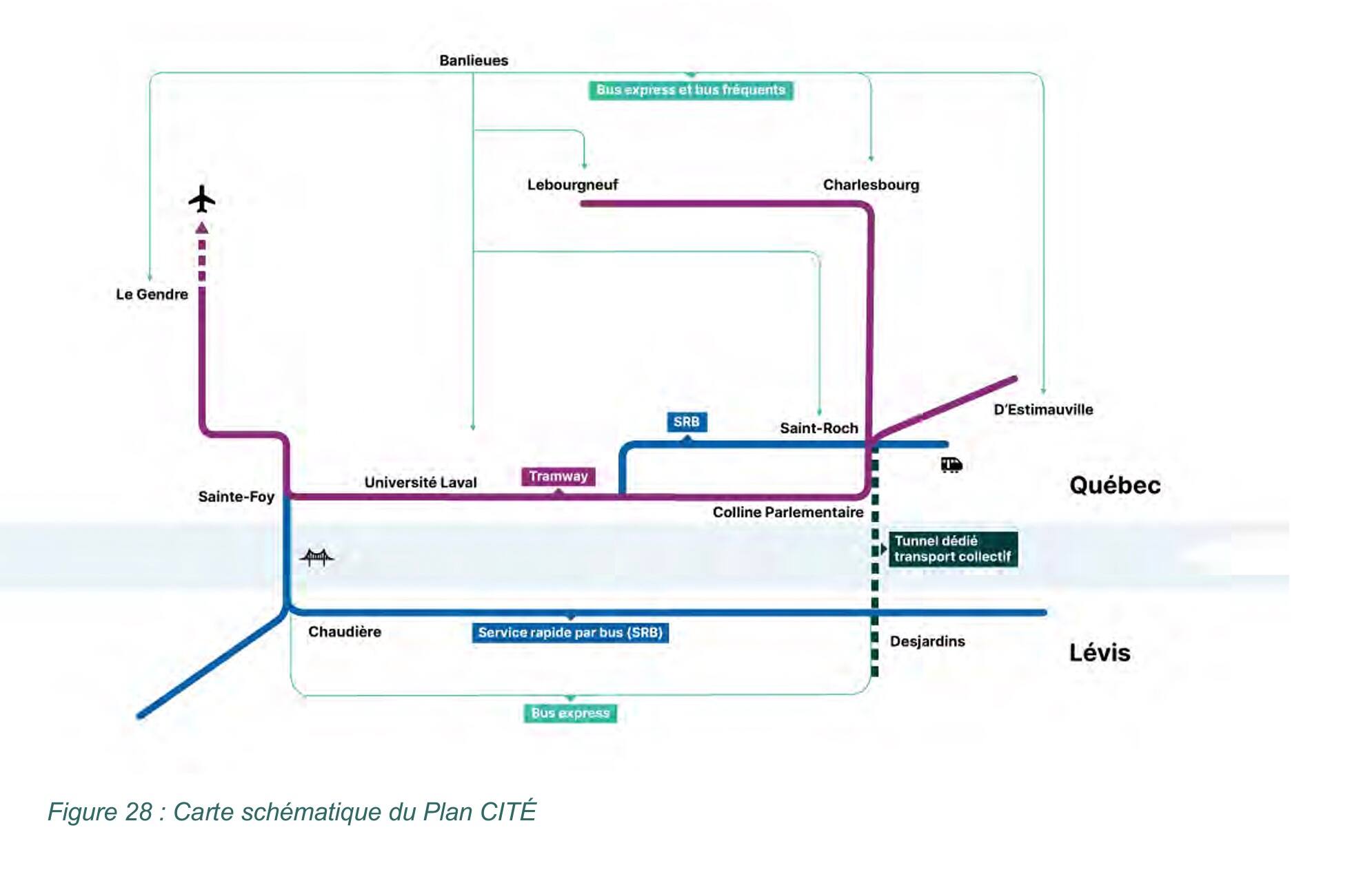 Además del tranvía, están previstas líneas SRB (servicio rápido de autobús), incluida una en Charest (610 millones de dólares), hasta Saint-Sacrement o Robert-Bourassa, y dos líneas SRB en Lévis: una en el bulevar Guillaume-Couture, que conecta el centro Desjardins hasta la terminal Sainte-Foy (2.400 millones de dólares) y otro en la Route des Rivières (710 millones de dólares).