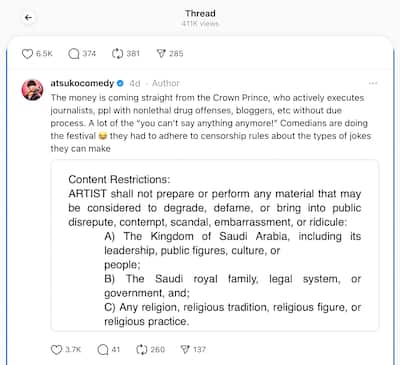 El humorista estadounidense Atsuko Okatsuka, quien rechazó la oferta saudita, compartió en hilos hace unos días una captura de pantalla de las “reglas de censura” impuestas por el festival que “muchos comediantes que ya no pueden decir nada” habían acordado doblarse, ella brina.