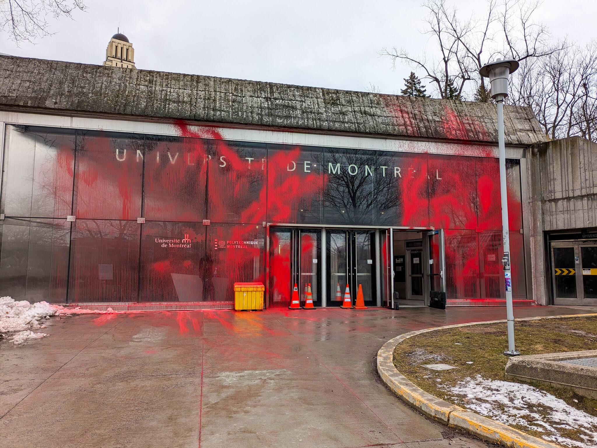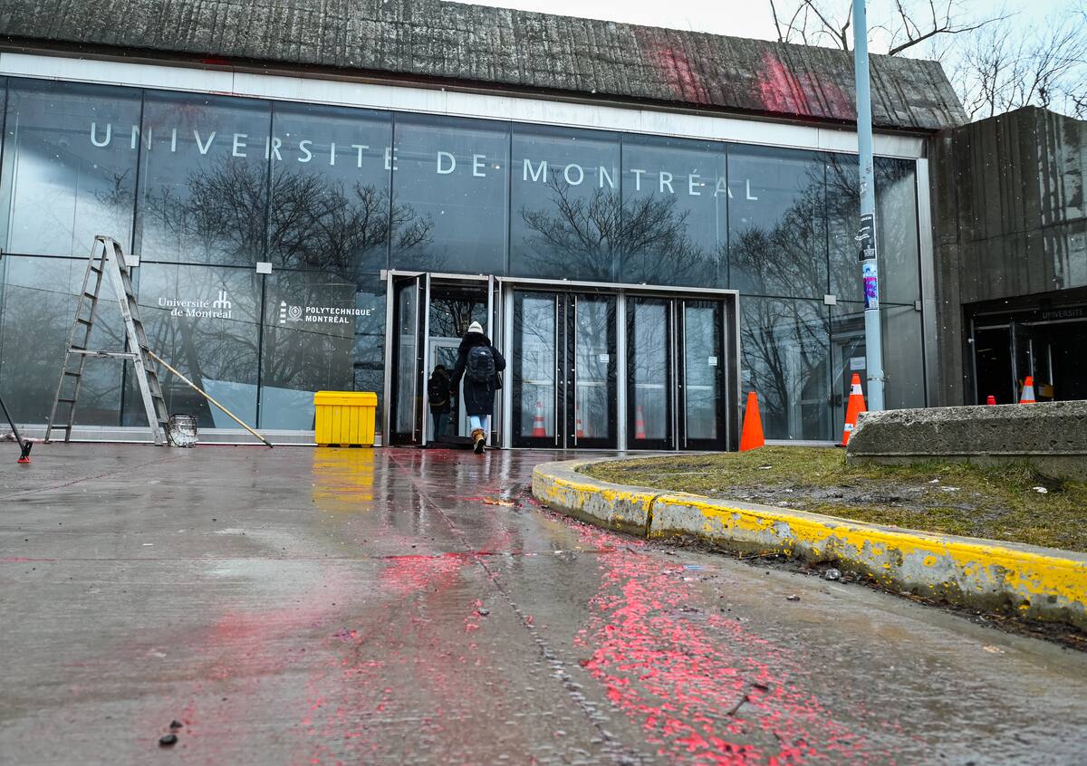 Los manifestantes propalestinos han alineado el frente de la Universidad de Montreal de la pintura roja, la madrugada del martes. Uno de los vándalos fue atrapado en el acto y arrestado por la policía.