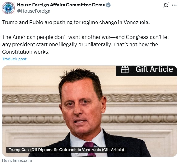 “Trump y Rubio están presionando para un cambio de régimen en Venezuela. El pueblo estadounidense no quiere otra guerra, y el Congreso no puede permitir que ningún presidente inicie una guerra de manera ilegal o unilateral. Por lo tanto, la Constitución no funciona”.