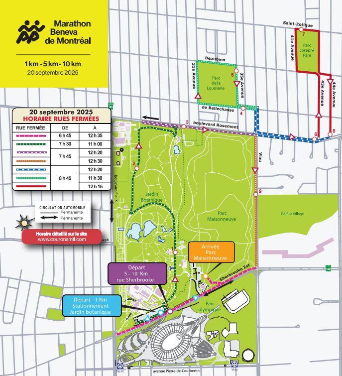Las calles cerradas el sábado se encuentran principalmente alrededor del Parque Maisonneuve, ya que son solo las carreras de 1 km, 5 km y 10 km que tendrán lugar.