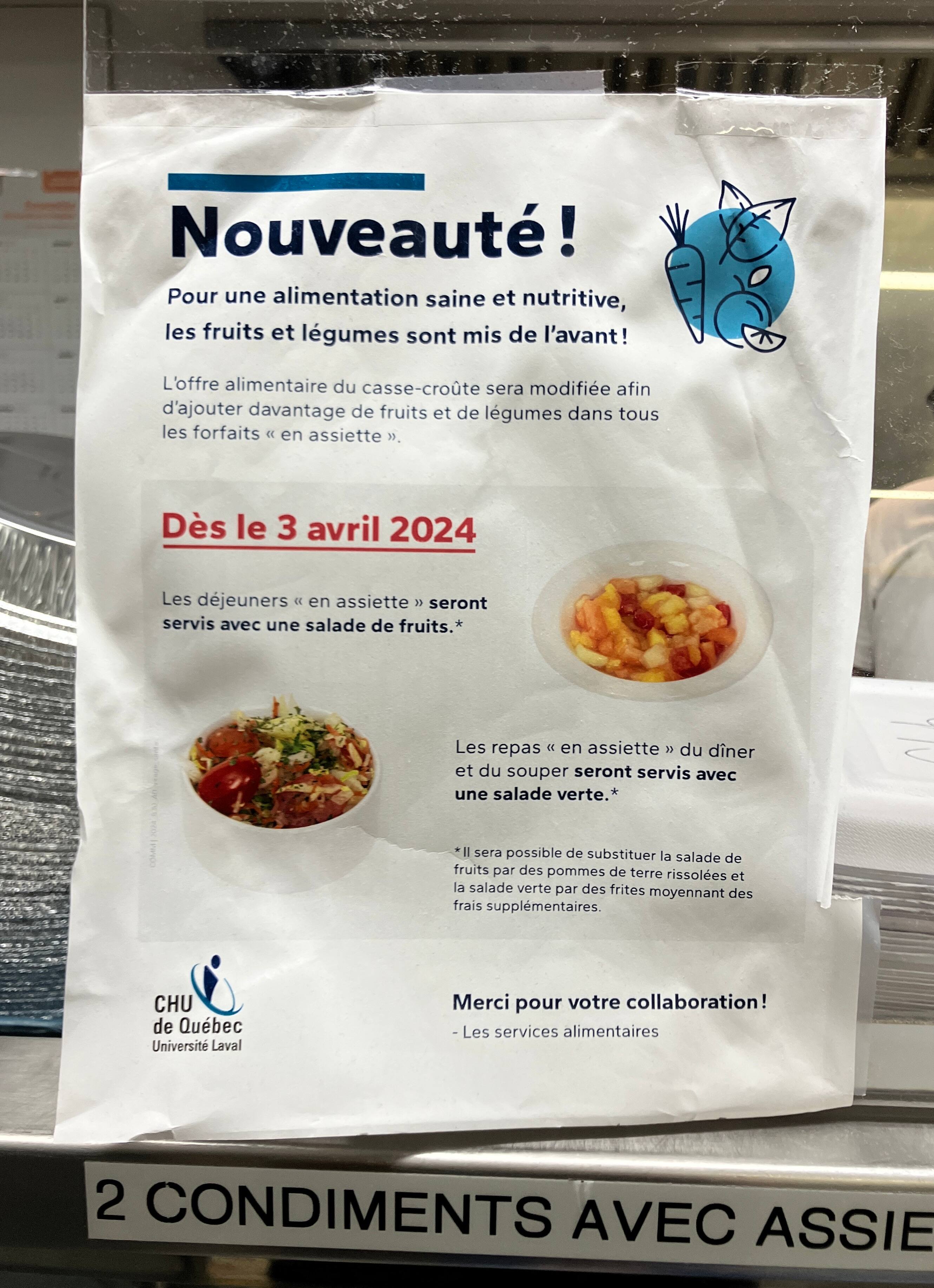 Aunque en los menús de las “snack bar” del Centro Hospitalario Universitario de Laval (CHUL) y del Hospital Saint-François hay opciones saludables como sándwiches, ensaladas, barritas proteicas y, más recientemente, bowls veganos, siempre encontramos poutines de. todos los tipos, hamburguesas con queso y perros calientes.