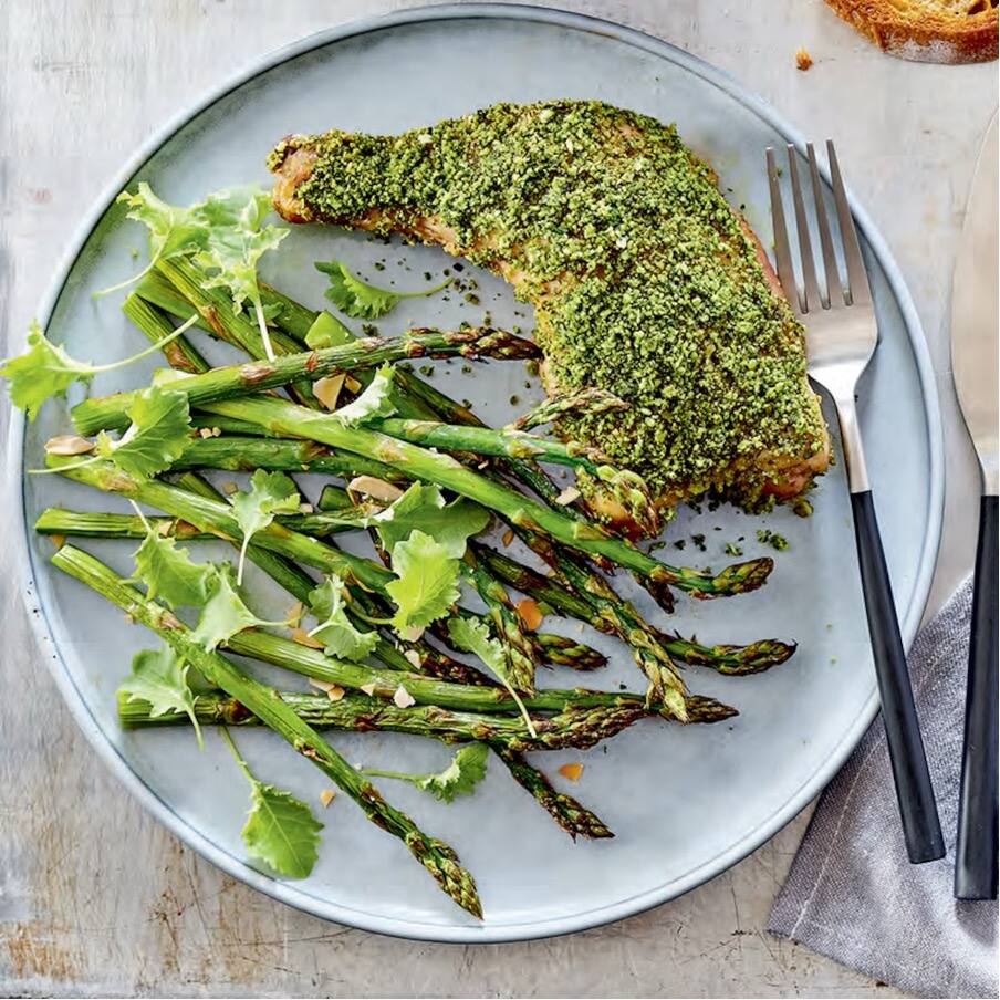 PIES DE POLLO ASADOS CON COSTA DE HIERBAS Y ESPÁRRAGOS ASADOS CON ALMENDRAS