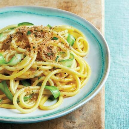 ESPAGUETIS A LA CARBONARA CON ESPÁRRAGOS, PAN rallado DE LIMÓN Y PEREJIL