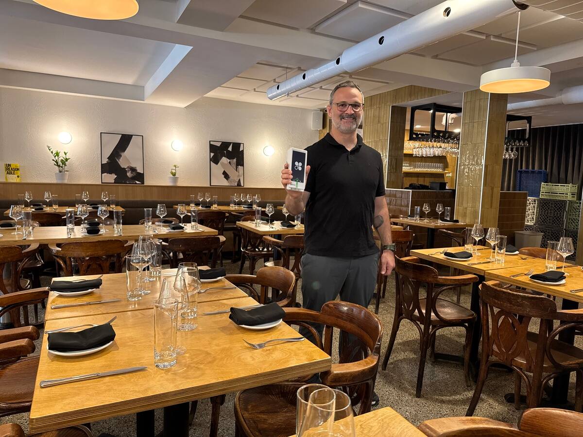Durante nuestra visita, el restaurador acababa de recibir sus nuevas terminales de pago, que deben incluir opciones de punta antes de los impuestos, y estaba a punto de instalarlos.