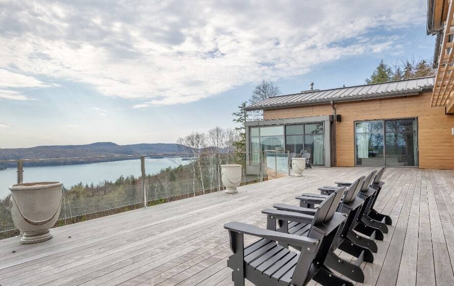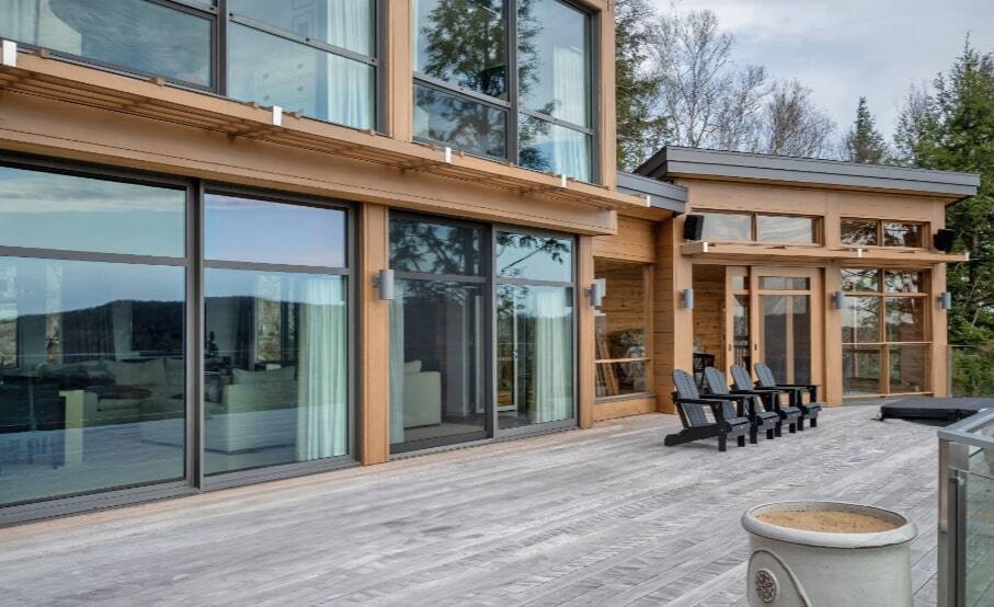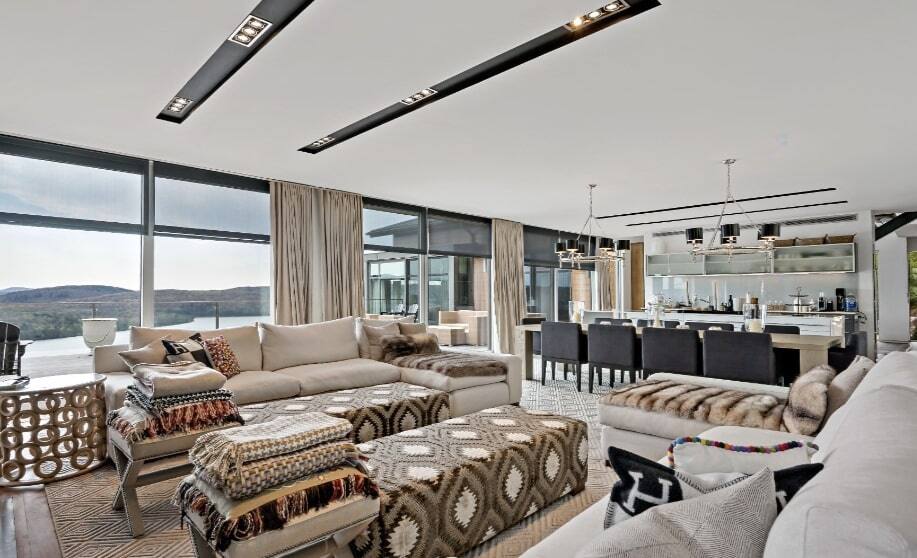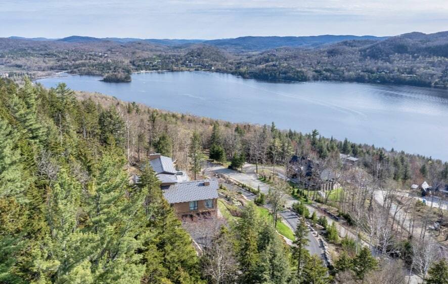 La residencia, construida en 2012, se encuentra en lo alto de una parcela inclinada de 148.000 pies.2o 3,4 acres, que ofrecen una vista espectacular del popular Lac Tremblant. Esta casa, que da al parque nacional de Mont-Tremblant, también cuenta con un porche y una gran terraza equipada con spa.