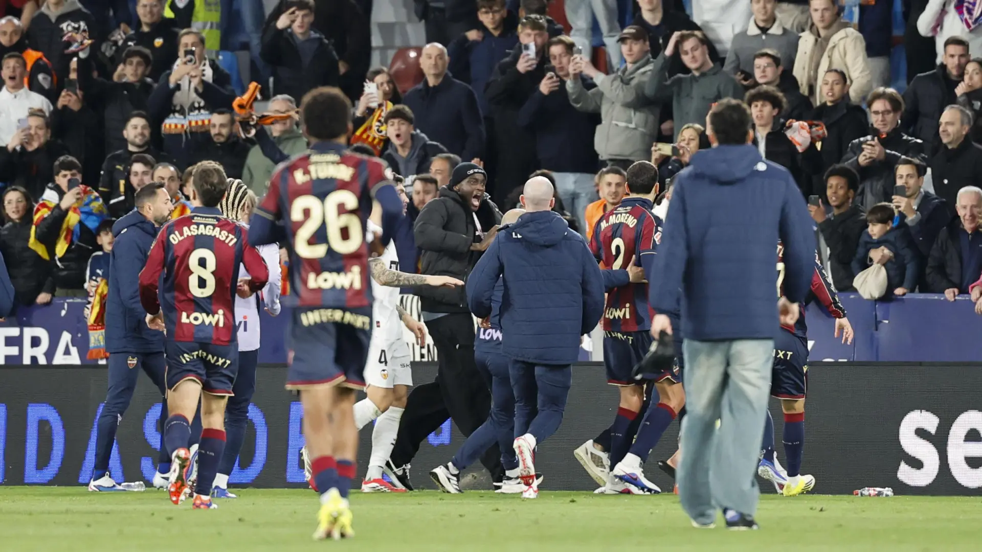 El derbi valenciano disputado entre el Levante y el Valencia este domingo terminó con una pelea y con lanzamiento de botellas tras una celebración del central valencianista Eray Cömert.