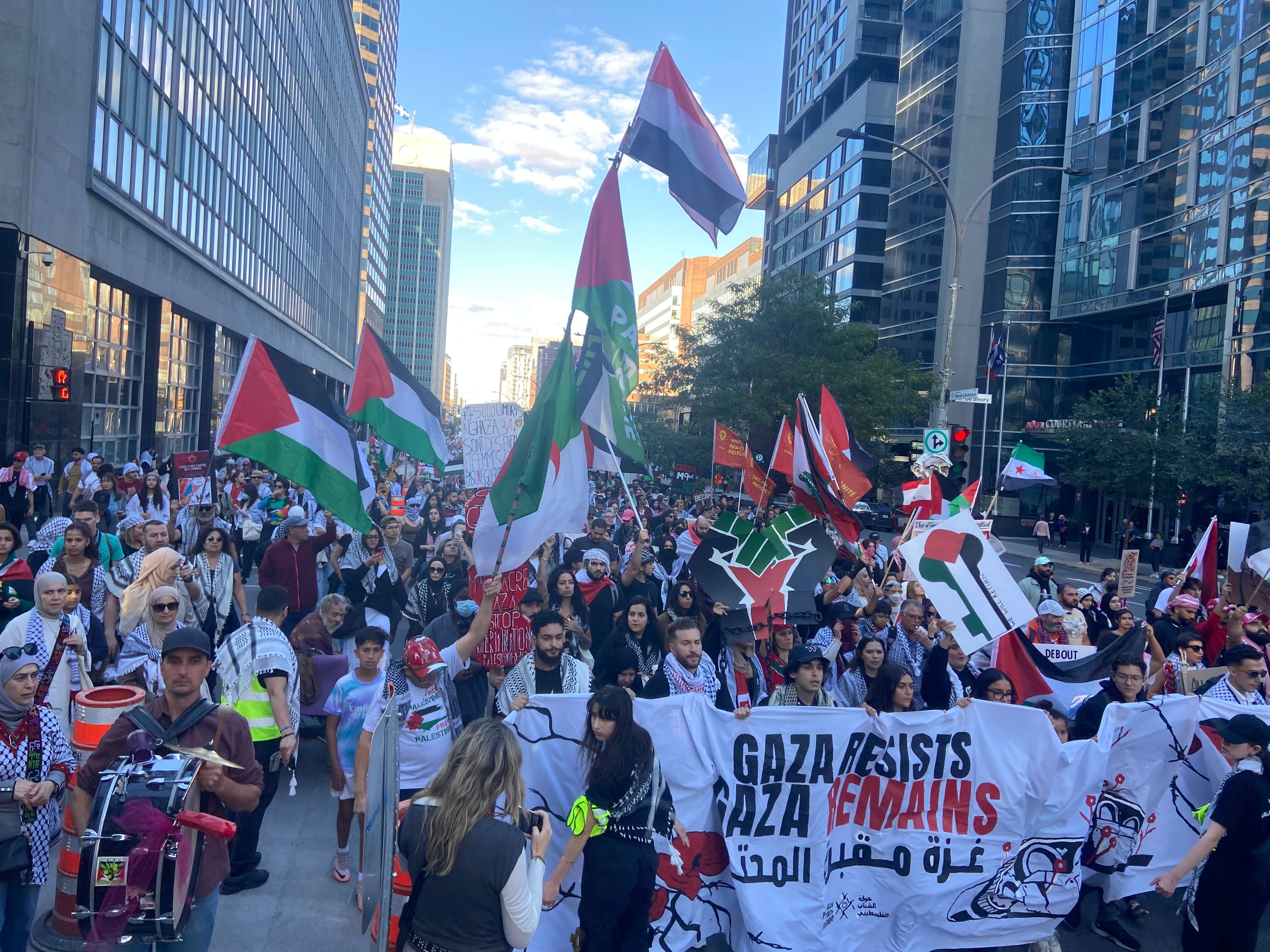 Miles de manifestantes se reunieron en el centro de Montreal como parte de un movimiento internacional para conmemorar un año de “resistencia a la guerra genocida” en Gaza.
