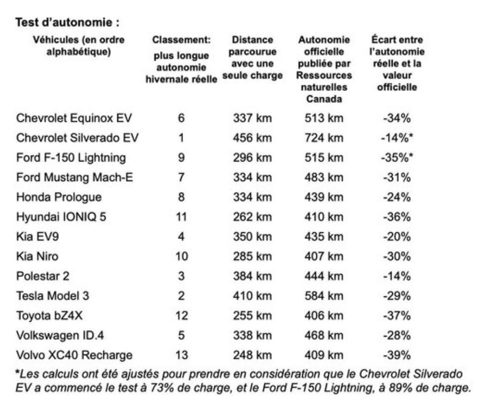 El viaje elegido fue de unos 330 kilómetros y cada vehículo fue conducido a la falla de la batería. Sin embargo, no todos los modelos evaluados pudieron explorar esta distancia. Aquí están los resultados compilados por CAA Québec para averiguar qué vehículo puede viajar la mayoría de los kilómetros en invierno. La clasificación va de lo menos bueno a lo mejor. Una tabla comparativa también está disponible al final de este artículo.