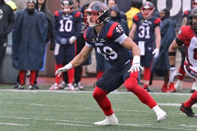 Jonathan Sénécal en acción durante el partido preparatorio de Alouettes disputó el sábado 24 de mayo de 2025 en el estadio Percival-Molson en Montreal.