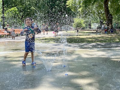 Le Petit Gael, de 4 años, aprovechó los juegos de agua en Lafontaine Park, en Montreal., 24 de junio de 2025, mientras que Mercurio alcanzó los 32.5 grados Celsius, rompiendo el récord establecido en 2003. Foto Anouk Lebel