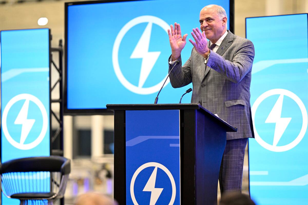 El ex Ministro de Economía de Quebec Pierre Fitzgibbon en la inauguración de la planta de baterías de leones en abril de 2023.