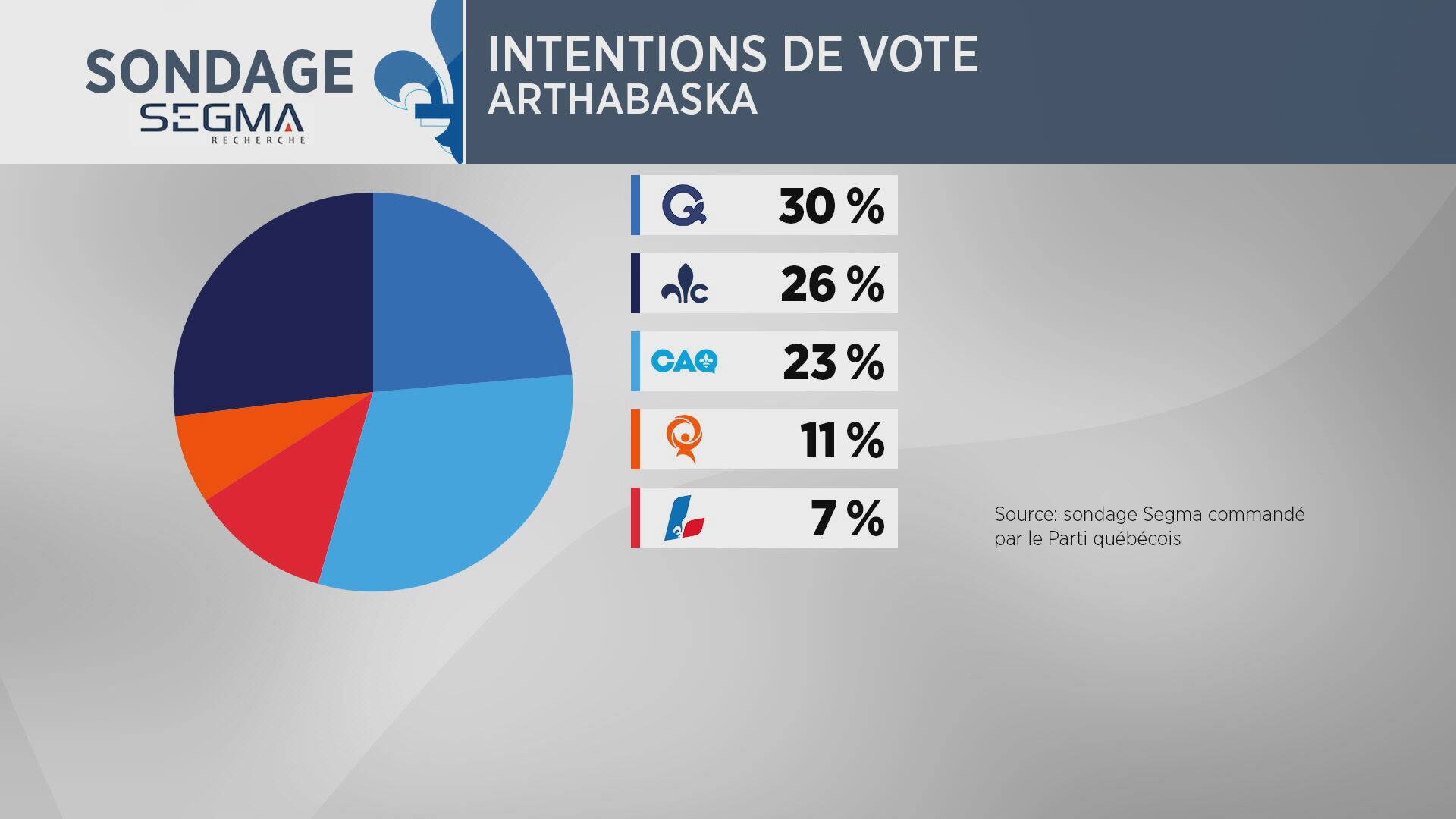El PCQ ocupa la segunda posición en intención de voto en Arthabaska (26%), detrás del Parti Québécois (30%), según una encuesta de Segma.