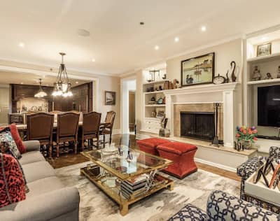 Construido en 1988 en una parcela de casi 12.000 pies cuadrados.2esta propiedad de lujo también incluye un sótano completamente terminado, un gimnasio, una sauna, un trastero, cuatro chimeneas, un garaje para cinco coches y espacio exterior con capacidad para tres más.