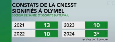 En cuanto a los hallazgos del CNESST reportados a Olymel en el sector de seguridad y salud en el trabajo, se reportaron 13 accidentes en 2021, diez en 2022 y 2023 y tres en 2024 (al 15 de octubre).