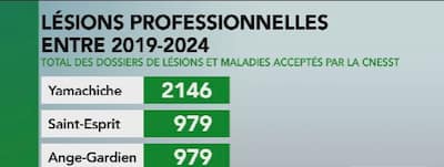 Según los datos, las fábricas de Olymel donde hay más expedientes de lesiones y enfermedades aceptados por la CNESST entre 2019 y 2024 son en Yamachiche (2146), Saint-Esprit (979) y Ange-Gardien (979).