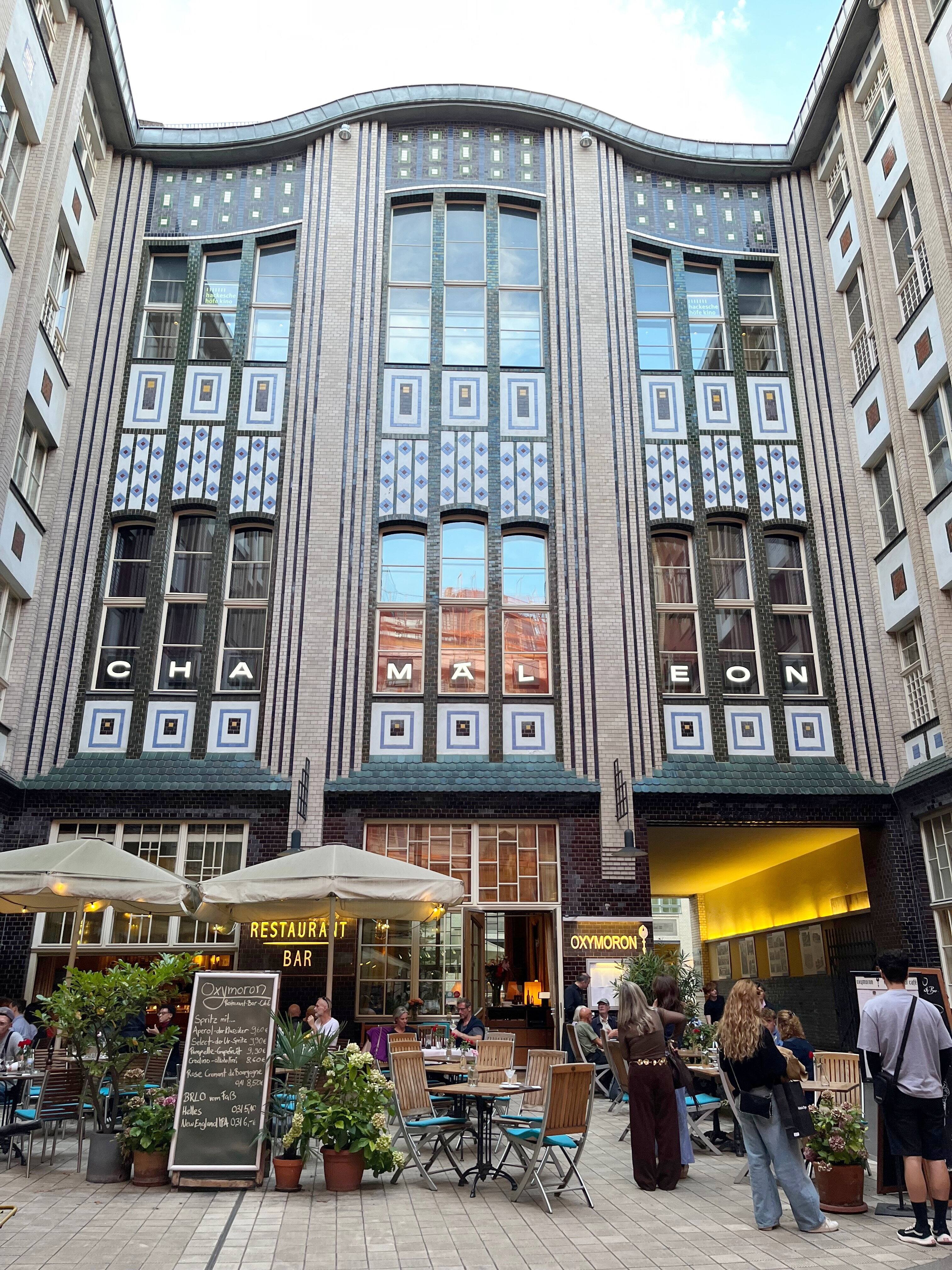 Hackescher HOF: Los cursos interiores del distrito de Mitte están llenos de direcciones modernas de todo tipo, como este restaurante que da la bienvenida al amantes de la comida Llegó a satisfacerse antes de un espectáculo o una noche de cine.[1]