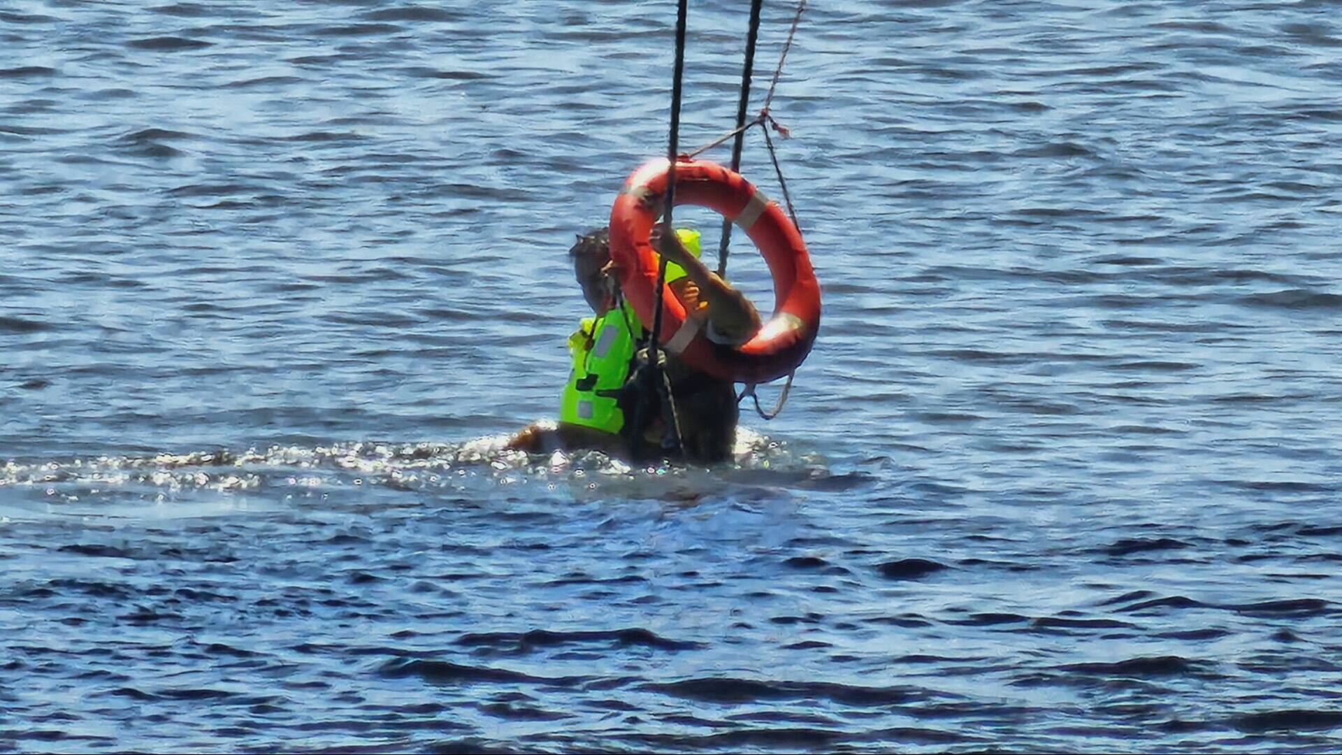 Mm. Lortie y Wolfe rápidamente subieron a bordo de un recipiente de transporte que se movió con una grúa. Los dos rescatistas pudieron sacar al marinero del agua cuando el contenedor se bajó a su altura.