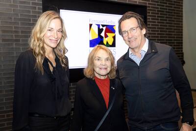 La pintora y escultora Françoise Sullivan está rodeada de Pascale Bourbeau y Pierre Karl Péladeau, presidente y director ejecutivo de Quebecor.