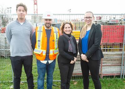 Las residencias objeto de la asociación con Videotron estarán ubicadas en Montreal, Lévis, Longueuil, Terrebonne, Saint-Jean-sur-Richelieu y Granby. En la foto vemos a Lucas Dpéré, Gestion Dupéré, Stéphane Perigny, Sidcan, Isabelle Marier, analista de Mission Unitainés, y Julie Favreau, asesora senior de Mission Unitainés y CEO Fi3.
