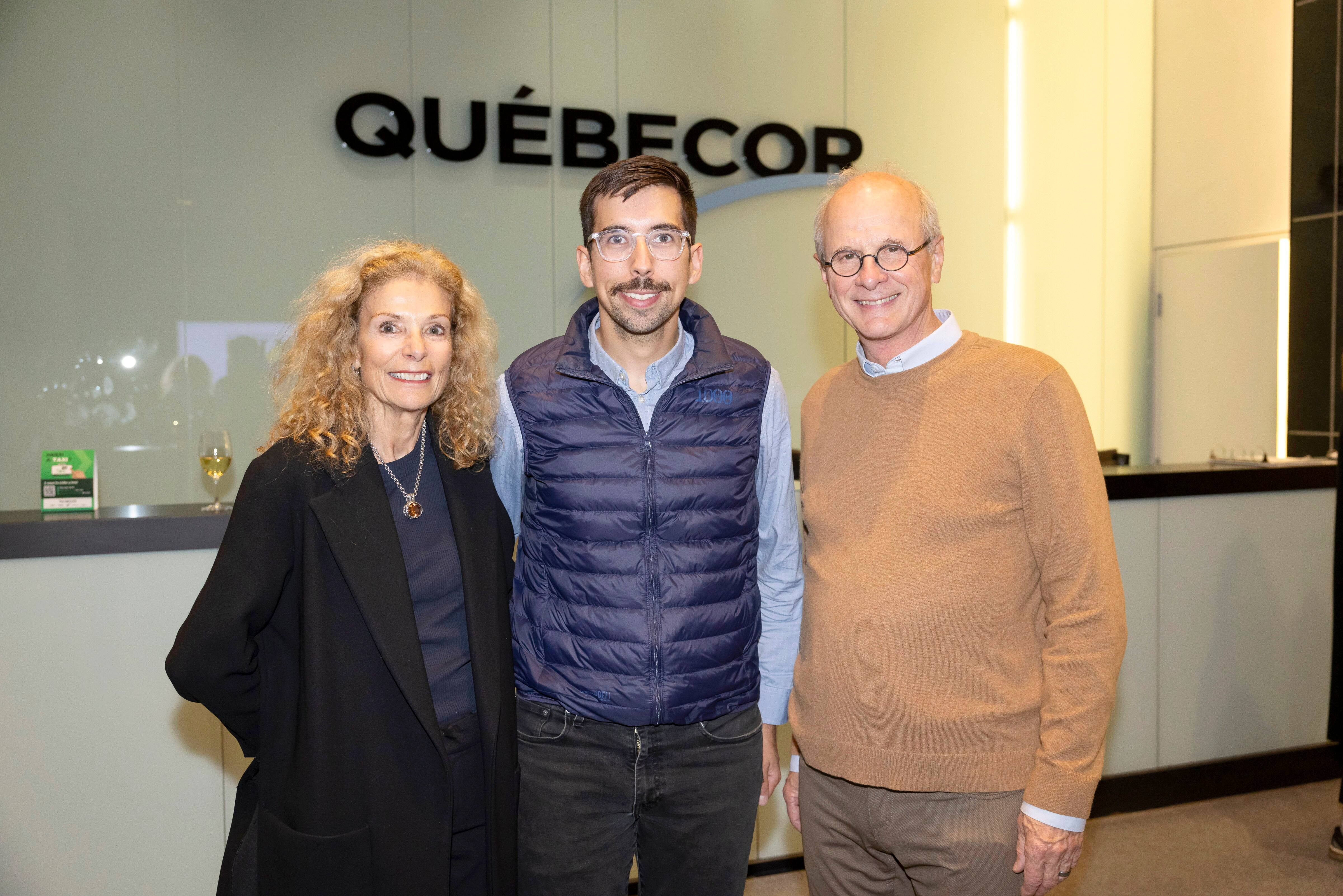 La pintora y escultora Françoise Sullivan está rodeada de Pascale Bourbeau y Pierre Karl Péladeau, presidente y director ejecutivo de Quebecor.